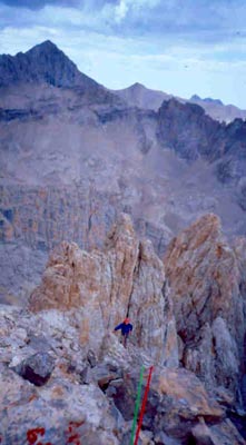 Biraz bakınma,biraz sıvı alma, bir parça çikolata yeme gibi rutinleri takiben,malzemeleri kuşanıp kaya botlarını giyince,Kürşat lider girmek istiyor.İki kulenin sırtları arasında çürük,döküntülü ve sarımtırak renkli başlayan derin bir kaya kulvarı yukarı gidiyor,sevimli bir yer değil ve tamamen dik.Ara emniyet konusuysa adı var kendi yok gibi olsa bile ,Allahtan öyle değil ,Kürşat sağlam noktalar atmayı başarıyor.Bu şekilde , kırmızı-yeşil çift iple yükselen Kürşat,kısa duraklamalarla kulenin sırtı üzerine varıp görüş açımdan çıkıyor.Azsonra da istasyonu kurduğunu bağırarak beni yanına alıyor.Kaya kulvarının zorluğuna III+, IV- derece denilebilir ama çürüklük her tür derece tahminini saptırıyor bence. Bu tür yerlerde, görece kolay yerler bile son derece başbelası olabilir.. Kulenin omzuna tırmanınca Kürşat’ın istasyonunu görüyorum.Zirveye ulaşan yarım ip boyunu da ben lider gidiyorum,III derece ve tabii ki çürük. Ancak manzara etkileyici :Kaya parmakları arasında tırmanan iki dağcı! Zirveyi oluşturan küçük platformda bir taş baba var ama aradığımız halde hiçbir yazı,not vb. bulamıyoruz.Bizden evvel birileri elbette ki tırmanmış, ama bizim kuzey rotasından olması çok olası değil.Anlaşılan o ki, Avcıbeli vadisi veya Kaldı buzul çanağı tarafından daha kolay bir rotası var bu dağın,zaten zirveden bakınca da bu olasılık görülebiliyor.